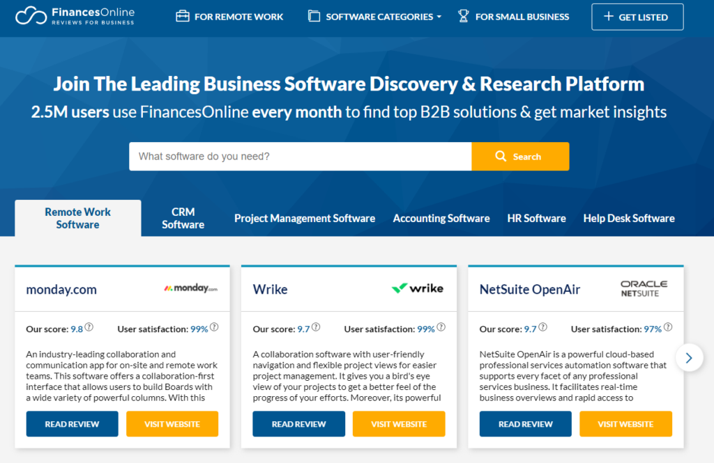 В качеството си на онлайн пазар, Capterra свързва купувачите с продавачите на софтуерни технологии. Компанията помага на милиони потребители да намерят най-добрите софтуерни решения. В примера тук можете да видите, че предоставя множество ценни детайли, както и отзиви от потребители.