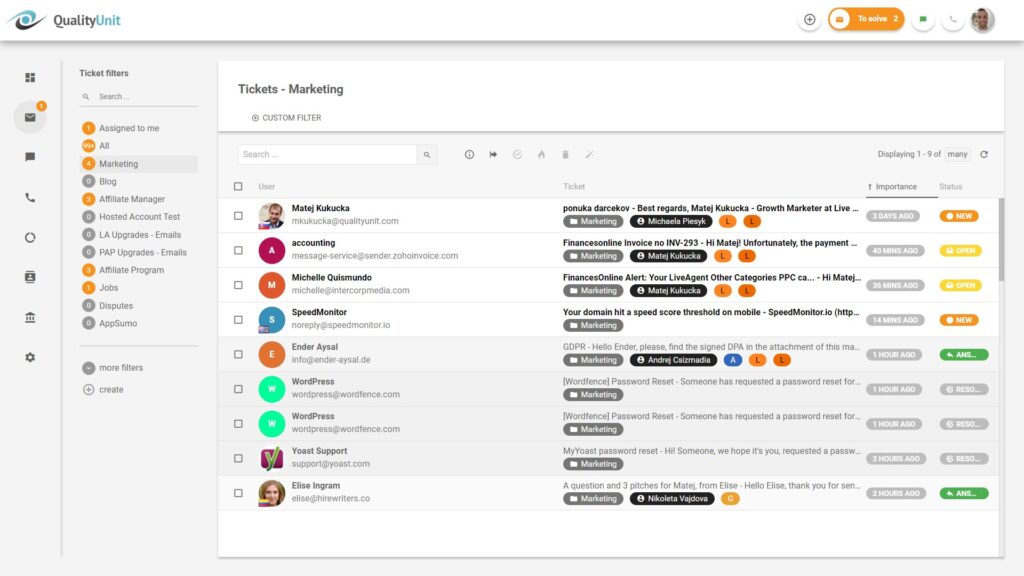 Открийте всички функционалности на LiveAgent, водещ многоканален help desk софтуер, създаден да оптимизира управлението на тикети и клиентските запитвания. Автоматизирайте процесите, предотвратете сблъсъци между служители и подобрете клиентското обслужване с помощта на разнообразни функции като оценяване на служителите, управление на работно време и лесно прикачване на файлове. Разширете възможностите си с LiveAgent!