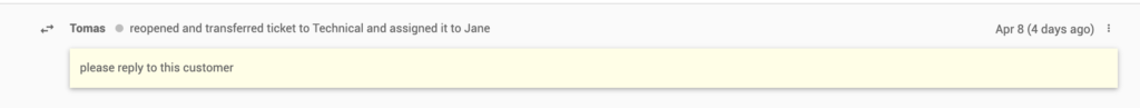 Не забравяйте, че ако тикетът бъде прехвърлен в друг отдел, той няма да бъде автоматично зачислен на служител в този отдел. Той ще бъде прехвърлен само в техния отдел и един отсътрудниците там трябва да поеме отговорността, като отговори или го възложи на друг агент.