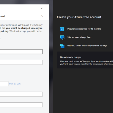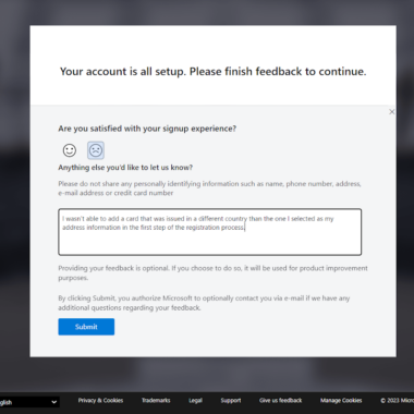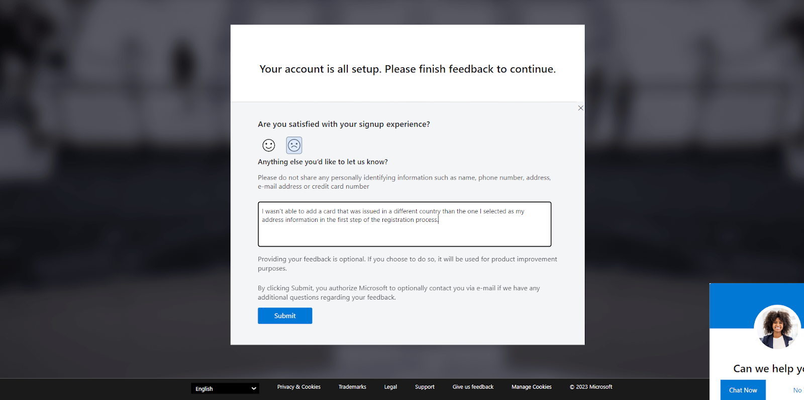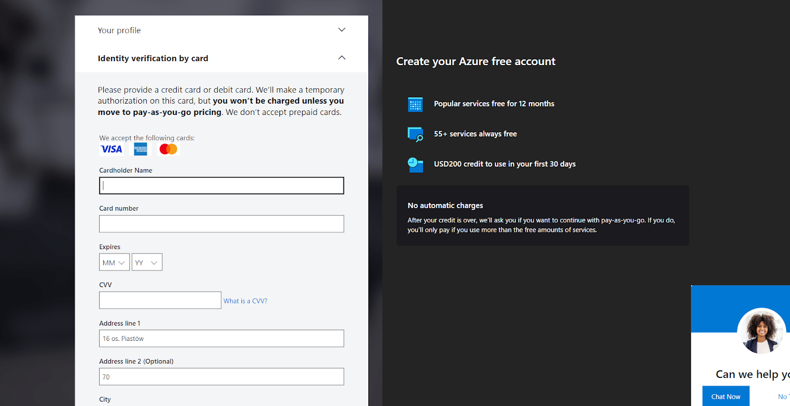 По-напред в процеса по регистрация, трябваше да въведа данните на банковата си карта. Никак не обичам този подход (особено когато пробвам безплатен инструмент, който да тестам, за да напиша отзив). Без много да му мисля обаче, дадох на Microsoft данните на картата си. В този момент обаче се сблъсках с проблем – не можех да ползвам карта, която не е регистрирана в същата държава, като тази, която избрах на предишната стъпка в информацията за адреса ми. Това беше малко дразнещо и затрудни процеса.