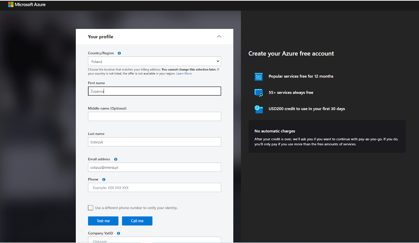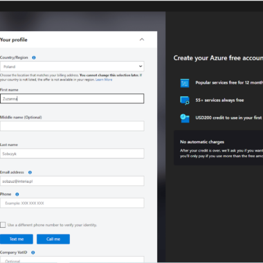 За да се регистрирате за чатбота, трябва първо да си създадете профил в Azure. За да го направя, отидох в уебсайта за безплатна регистрация. Имейл адресът ми веднага беше разпознат, защото вече имах създаден профил, така че трябваше само да въведа паролата си и да потвърдя входа през приложението Authenticator на телефона си.