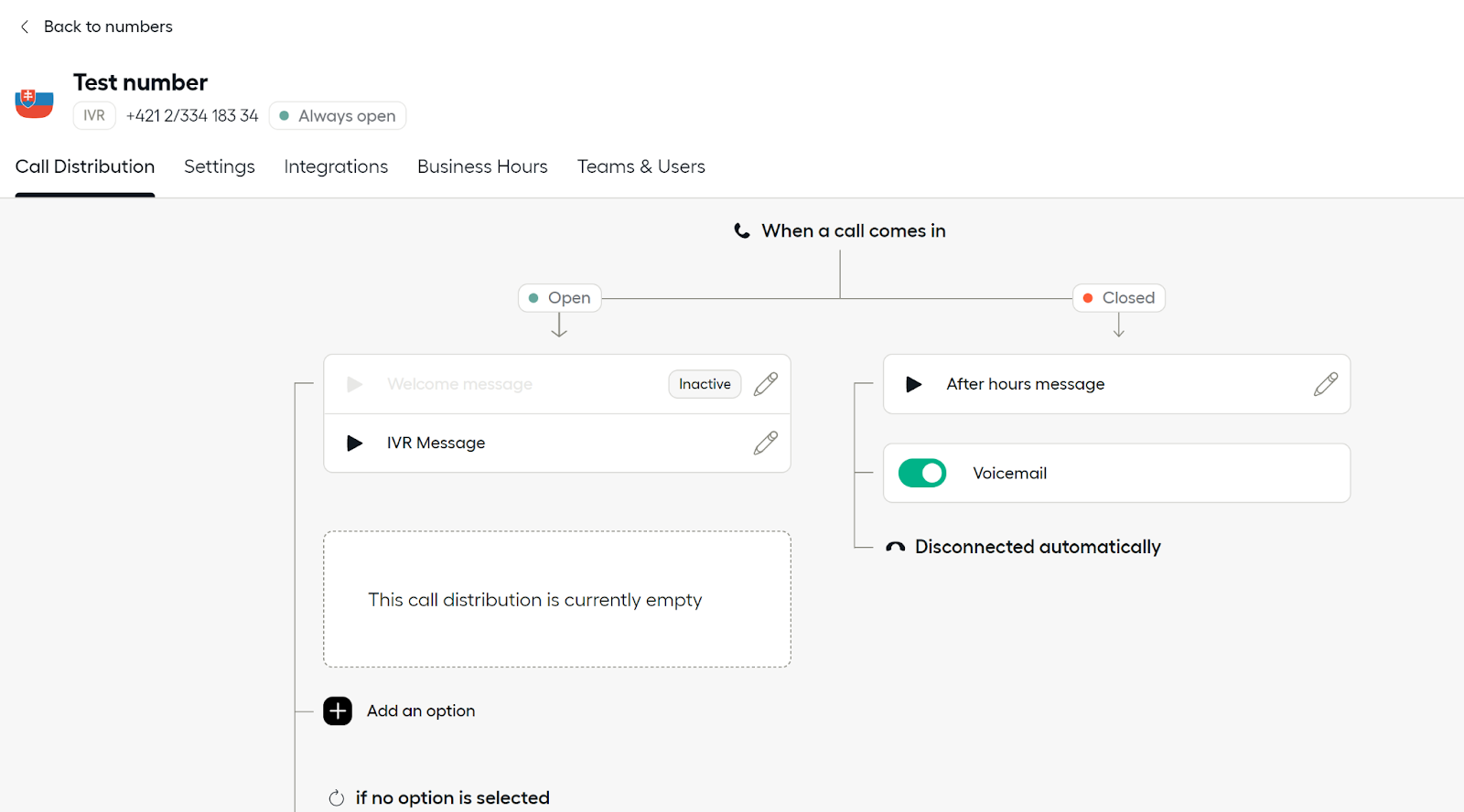 Aircall не поддържа директно създаване на IVR на много нива, но можете да пробвате да създадете подобна система като настроите няколко малки IVR-и за всеки от наличните номера. Като ги свържете чрез пренасочване, можете да симуритате изживяването то IVR на няколко нива.