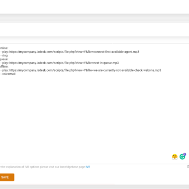 Настройката на IVR-а на LiveAgent в началото е малко необичайна. Не предлага визуално представяне на нивата, така че трябва да планирате предварително. Настройката на интерактивната система за гласови отговори и конфигурацията трябва да се направят чрез YAML скрипт. Ако за пръв път работите с него, не се притеснявайте – има налично ръководство и можете да намерите линка директно в IVR настройките на LiveAgent. Ако искате да избегнете писането на целия IVR, можете да изберете примерен IVR от тук, да го копирате и да го персонализирате според предпочитанията си.