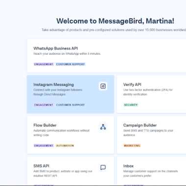 Регистрацията за тестова версия на MessageBird е съвсем проста. След като попълните данните си и добавите броя служители, ви посреща изчистено табло, което не натоварва потребителите, които го виждат за пръв път.