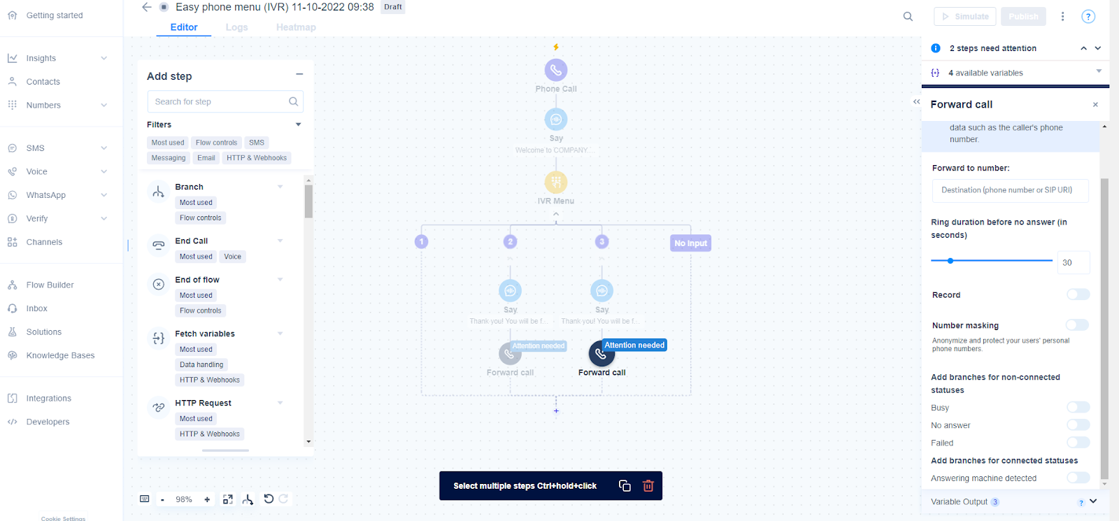 Цялата функция Flow Builder работи отлично без проблеми. Настройката е доста интуитивна благодарение на графичния потребителски интерфейс и ръководството в началото. За съжаление, IVR-ът не дава възможност за качване на лични аудио файлове, но ако това не е проблем за вас, функционалността текст към реч работи безпроблемно. Самото представяне на IVR функцията е отлично и ако търсите нещо просто и лесно за употреба, вероятно ще покрие всичките ви очаквания. Ако обаче имате проблем с разбирането на разклонения, променливи и всичко друго, свързано с IVR настройките, MessageBird предлага лесно за следване ръководство в центъра си за поддръжка.