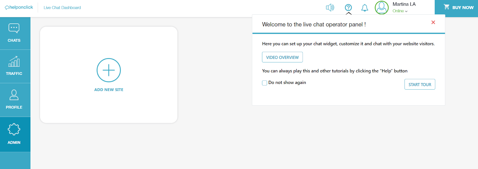 Хареса ми обаче изскачащия прозорец, който веднага ми предложи обиколка на приложението. Разгледах набързо и след това се гмурнах директно в това да настроя лайв чата си за тестовия ми уебсайт.