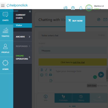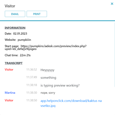 Друга полезна функция е автоматичното събиране на данни за посетителя, с когото чатите в HelpOnClick. Тези данни за посетителя включват местоположението, браузъра, IP адреса и други. След като приключите разговора си, може да се върнете към тази информация и да прочетете целия чат от архива.