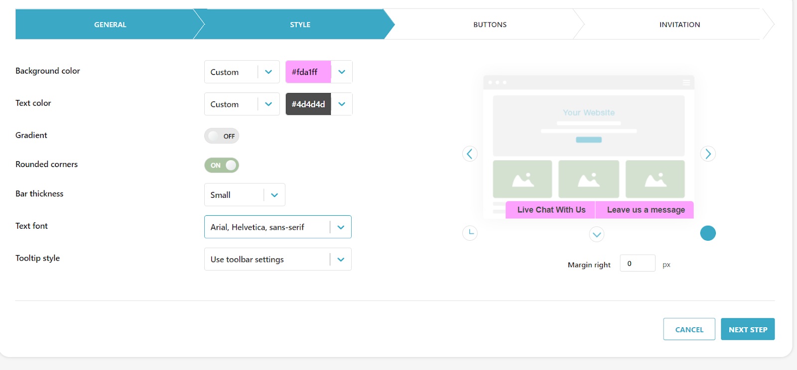 Хареса ми колко много възможности за персонализация имаше още от самото начало. Можете да промените почти всички визуални аспекти на бутона за лайв чат, който ще се показва на сайта ви.