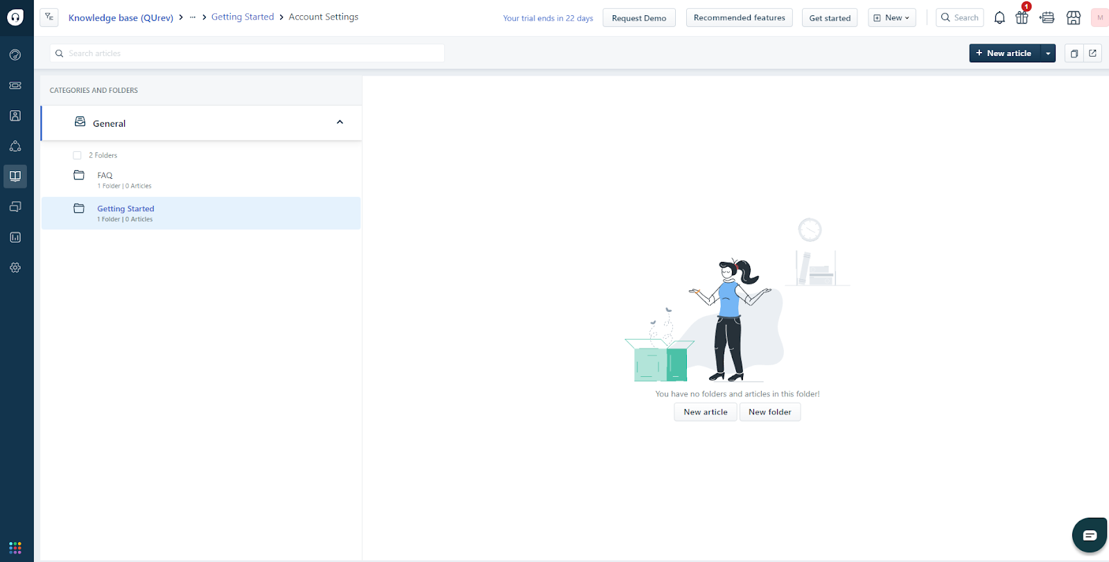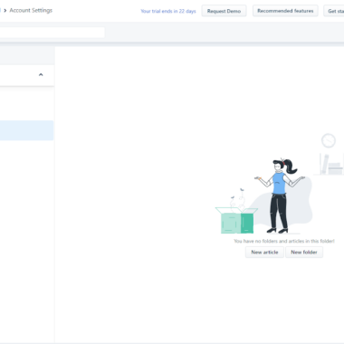 Тук можете да редактирате съществуващи папки или да създавате нови. В началото имате две папки, но можете да добавяте още. И сега, най-важната част, можете да започнете да пишете статиите в базата си знания. За да го направите, кликнете бутона New article в горния ляв ъгъл.