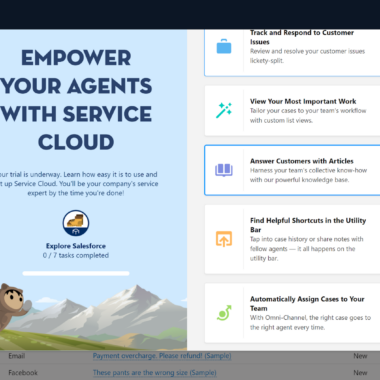 Salesforce е много добре познат софтуер за управление на връзките с клиенти и също така една от най-високо оценяваните CRM системи налични на пазара. Предлага лесно достъпен тестов период, с който можете да започнете работа върху базата си знания за нула време. Необходима е само проста регистрация и имейл потвърждение. Salesforce работи като уеб приложение, така че няма нужда да инсталирате нищо на компютъра си. Тъй като Salesforce разполага с огромно разнообразие от инструменти и функции, приложението предлага начално ръководство, където можете да изберете каква ще е основната употреба на Salesforce. Можете да изберете опцията Управление на база знания и системата ще започне кратка демонстрация, чрез която да ви запознае с интерфейса.