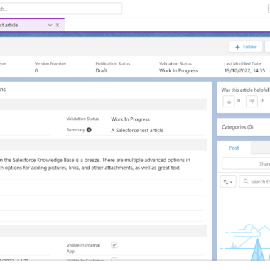 Освен редактора, ще откриете и настройки за видимост, данни и информация, както и много други в предварителния преглед на статията. Не е трудно да откриете най-важната информация, но интерфейсът изглежда малко претрупан в опити да покаже наведнъж възможно най-голяма част от това, което може да прави. Това е малък проблем в иначе функционалния дизайн. Като цяло, базата знания на Salesforce не е най-лошата, но не е и най-добрата.