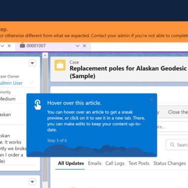 Въпреки че демонстрацията изглеждаше чудесно в началото, бързо даде бъг когато направих нещо различно от това, към което ме насочи. Сблъсках се със съобщение за грешка в демонстрацията в рамките на пет минути след като започнах да работя със Salesforce. Като цяло ръководството не беше много полезно, подсказките бяха объркващи и ми беше по-добре сам да разгледам приложението. Интерфейсът на приложението изглежда чудесно на пръв поглед, но много бързо може да ви се стори объркващ и неинтуитивен. Отне ми известно време да започна да пиша първата си статия в базата знания, след като се сблъсках с няколко препятствия.