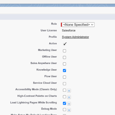 Можете да откриете базата знания като кликнете върху иконата App Launcher в горния ляв ъгъл и потърсите Knowledge. Звучи лесно, нали? Ако обаче сте нов потребител като мен, ще бъдете объркани защо не можете да създавате нови статии. Нямаше икони, нито пък опции за редактиране. Трябваше да потърся информация в онлайн ръководството, за да разбера, че първо трябва да си дам разрешение да създавам статии в базата знания в настройките. Тази опция се намира в Setup > Setup > Users. Трябва да кликнете върху потребителя, чиито права трябва да промените, и да отметнете кутийката до “Knowledge user”.