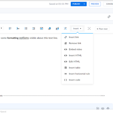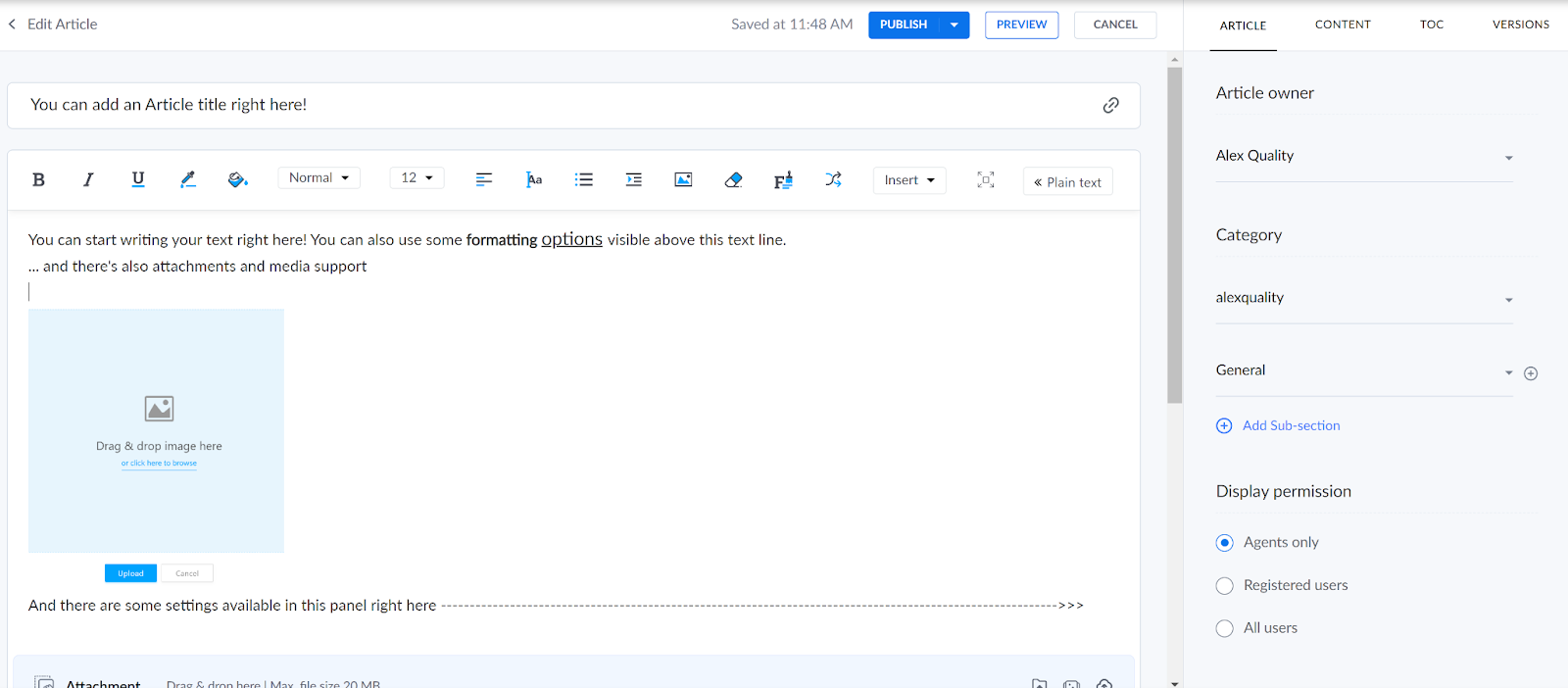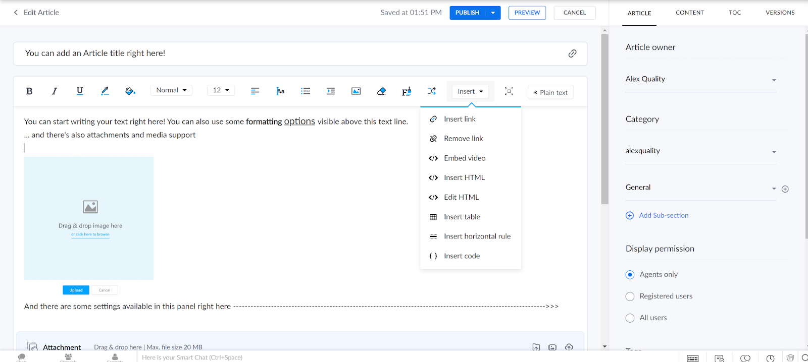 Работата с редактора за статии е безпроблемна и няма да се сблъскате със затруднения при намирането на която и да е функционалност. Писането на статии е напълно безпроблемно и можете да добавяте изображения. Има и възможности за вграждане на видеоклипове, HTML код, таблици и други елементи. Винаги можете да превключите към преглед на цял екран, за да се фокусирате по-добре върху писането. Това е наистина чудесна база знания, на която не ѝ липсва нищо важно.