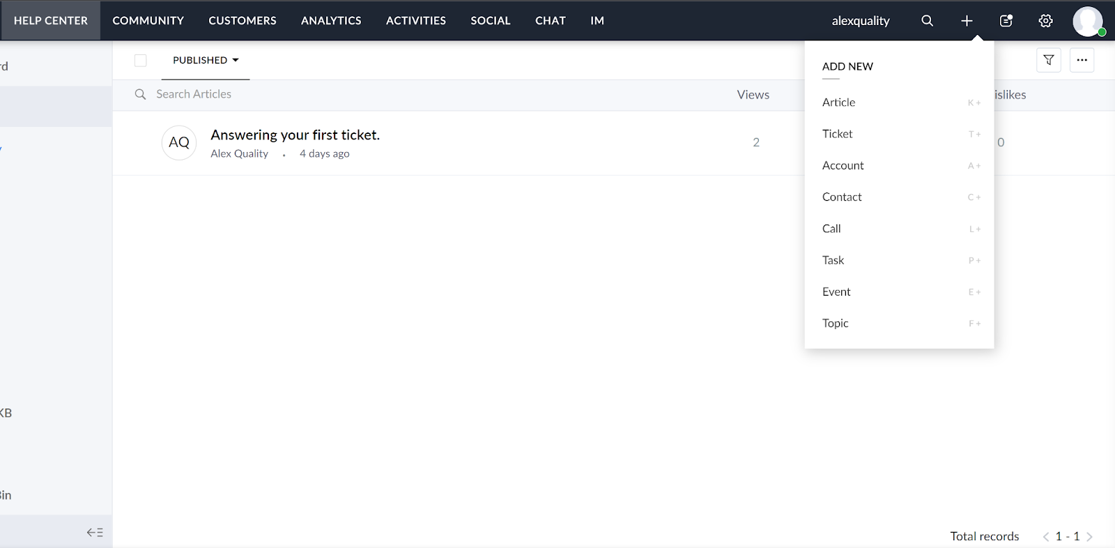 Можете да създадете статия в базата знания на Zoho Desk като кликнете върху бутона + в горния панел на менюто. Там можете да откриете опцията за създаване на нова статия.