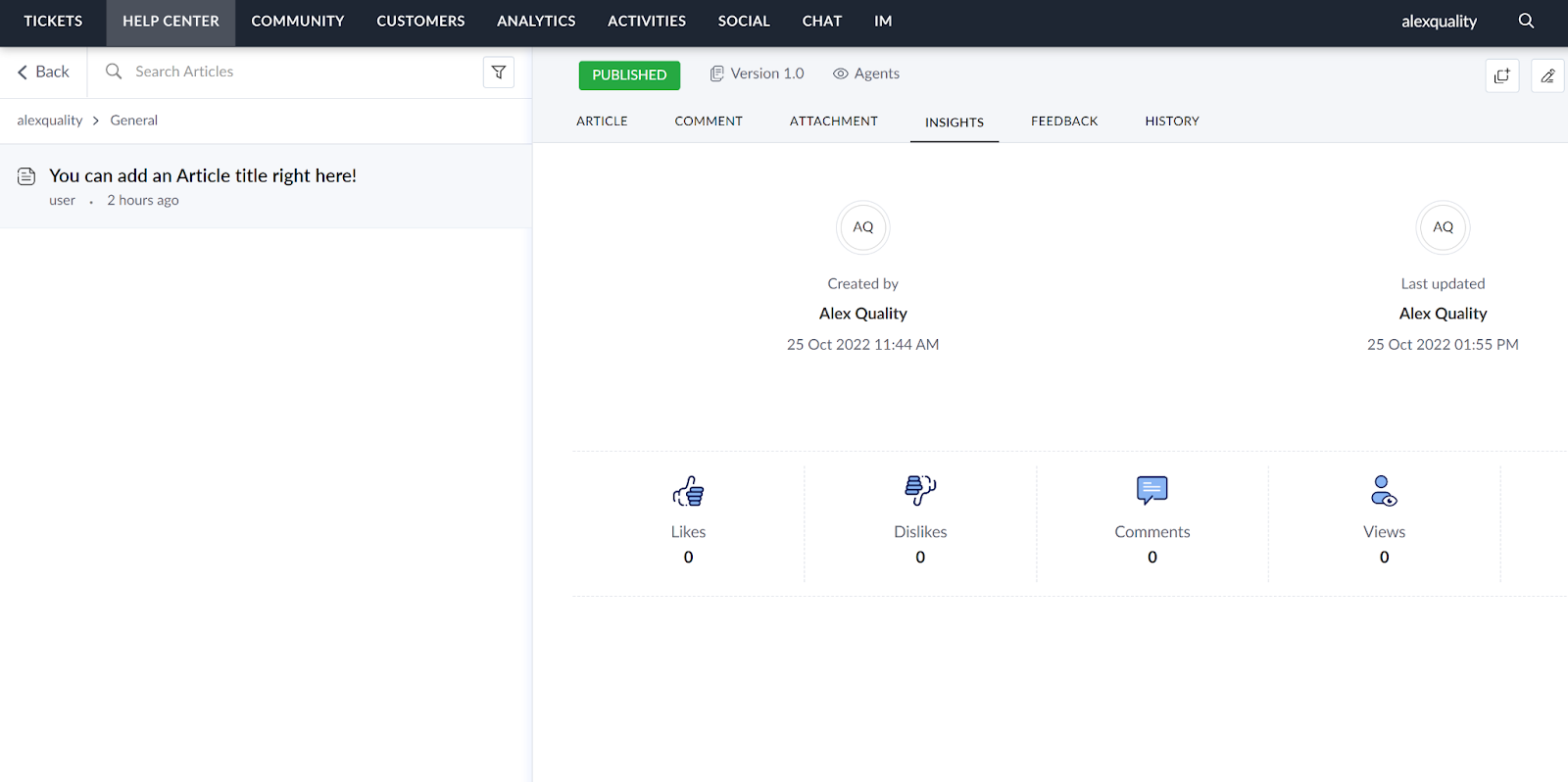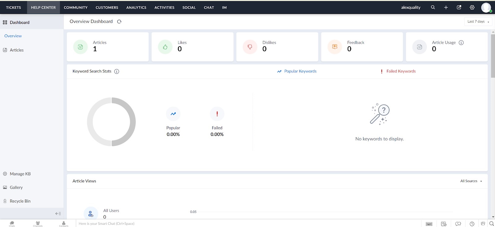 Базата знания на Zoho Desk се нарича Help Center. Просто кликнете върху Help Center в горното меню и ще бъдете пренасочени към базата знания на Zoho Desk.