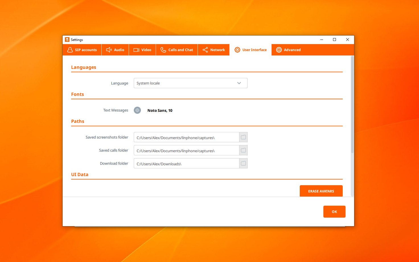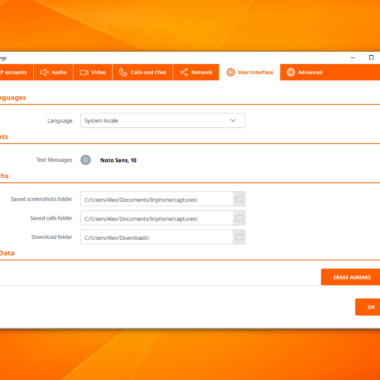 Настройките на приложението предлагат доста впечатляващ набор от възможности, чрез които потребителите могат да настроят приложението според своите предпочитания. Освен стандартните аудио настройки, като избор на аудио изход и аудио вход, можете да пробвате и различни аудио кодеци. Същото се отнася и за видеото и видео кодеци. Обажданията и чатовете имат отделен набор настройки: автоматични отговори, автоматичен запис на разговори, опции за известия и др. Приложението ви позволява също така да смените езика и дори да изберете шрифт за текстовите си съобщения.