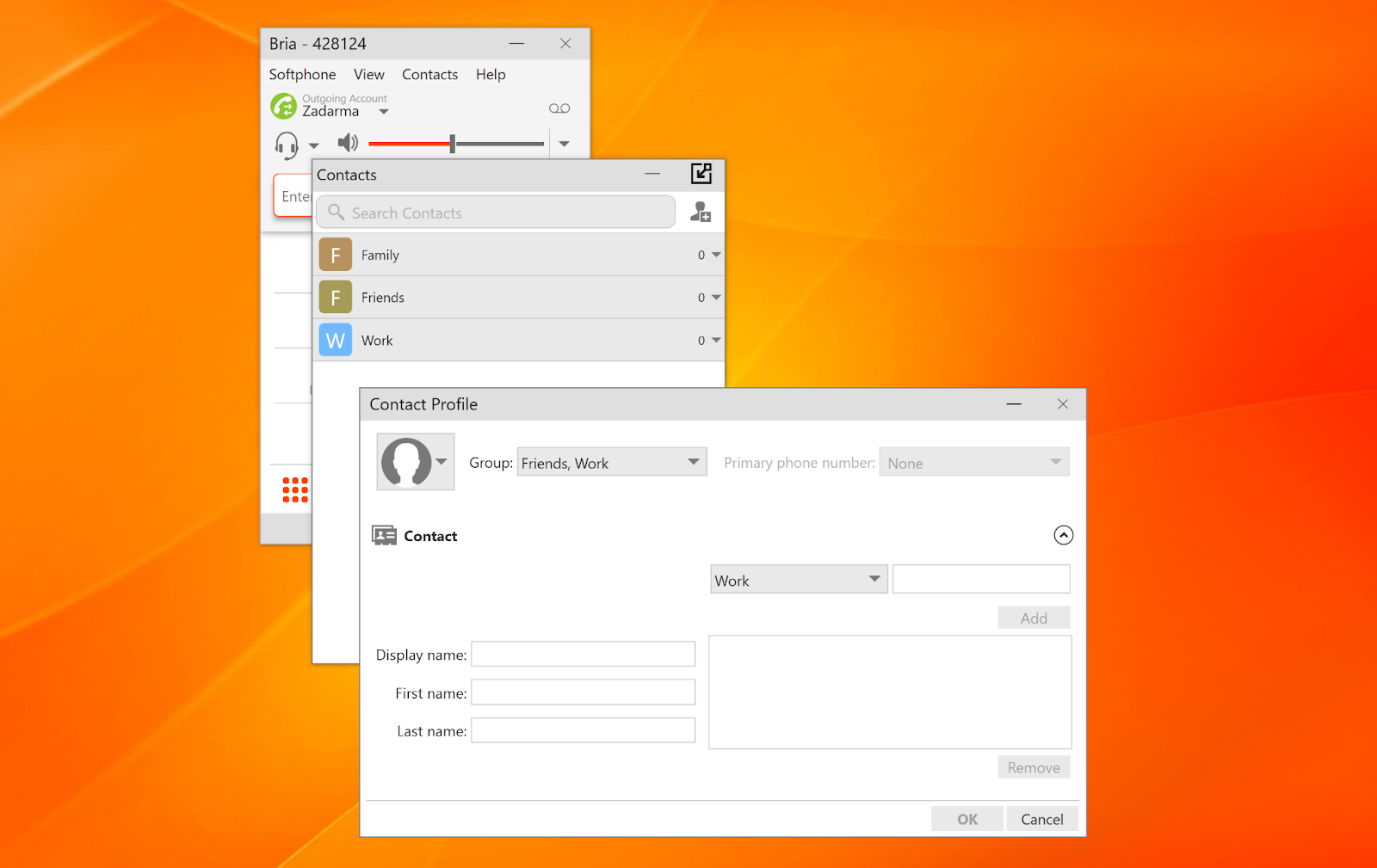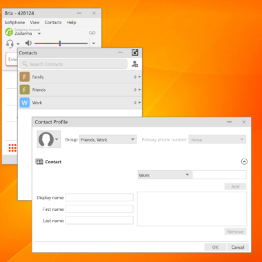 Създаването на нов контакт предлага някои възможности: псевдоним, име, фамилия и поле за номера и адреси: номер на софтфон, работен номер, домашен номер, имейл адрес, уебсайт и опцията “Други”, където потребителят може да въведе каквато информация му е необходима. Няма опция, която да позволява на потребителите да напишат коментар или проста бележка в детайлите на контакта, което е още един недостатък на списъка с контакти на Bria.