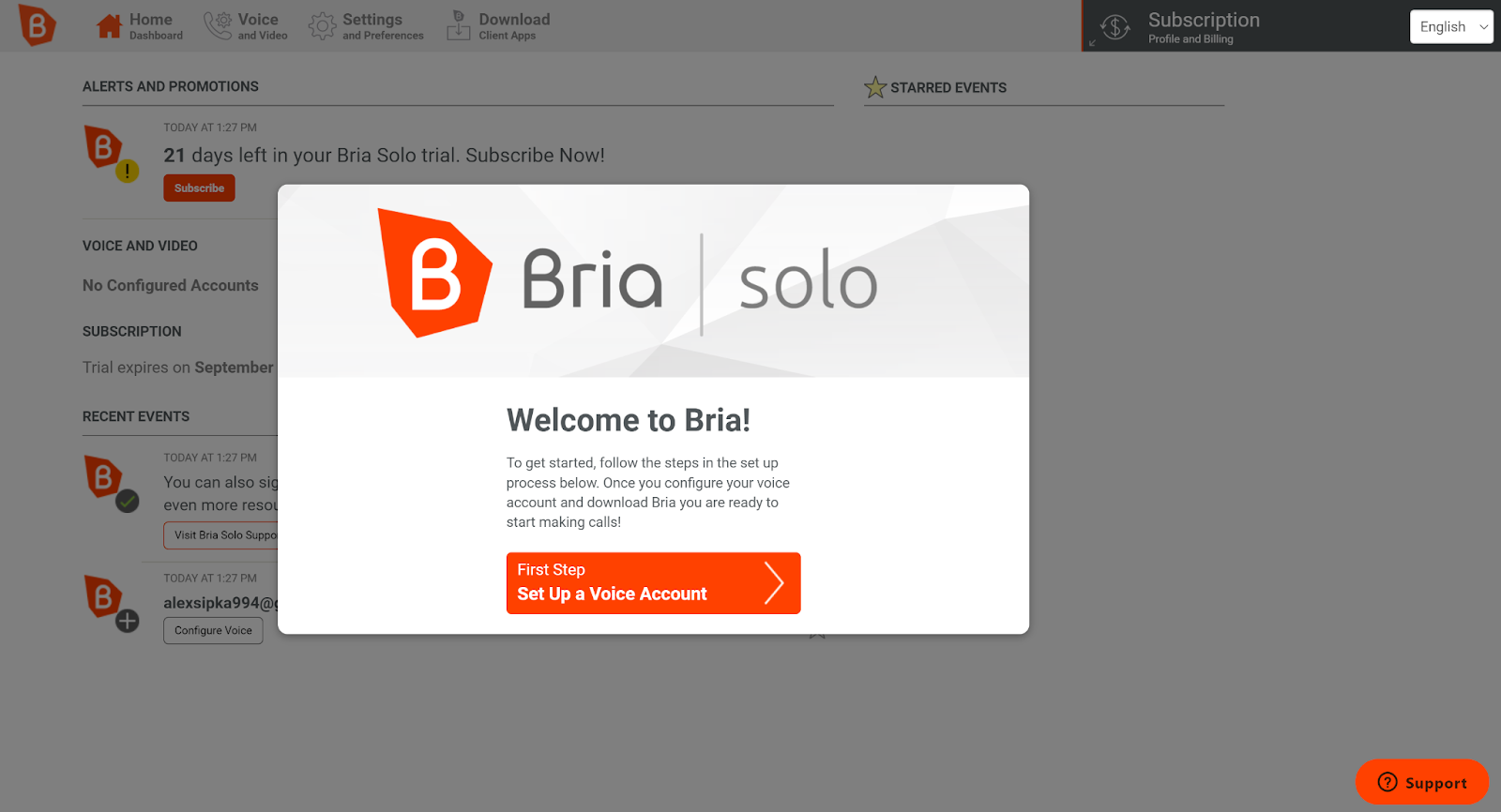 Процесът започва със създаване на нов профил в уебсайта на Bria. Аз започнах с тестова версия. За целите на този отзив, избрах тестовата версия на Bria Solo. Отне ми само няколко минути и уебсайтът не ме принуди да избера начин на плащане или да въведа банкова карта. След като предоставих данните си, бях посрещнат с просто съобщение, което ми показваше каква е следващата стъпка.