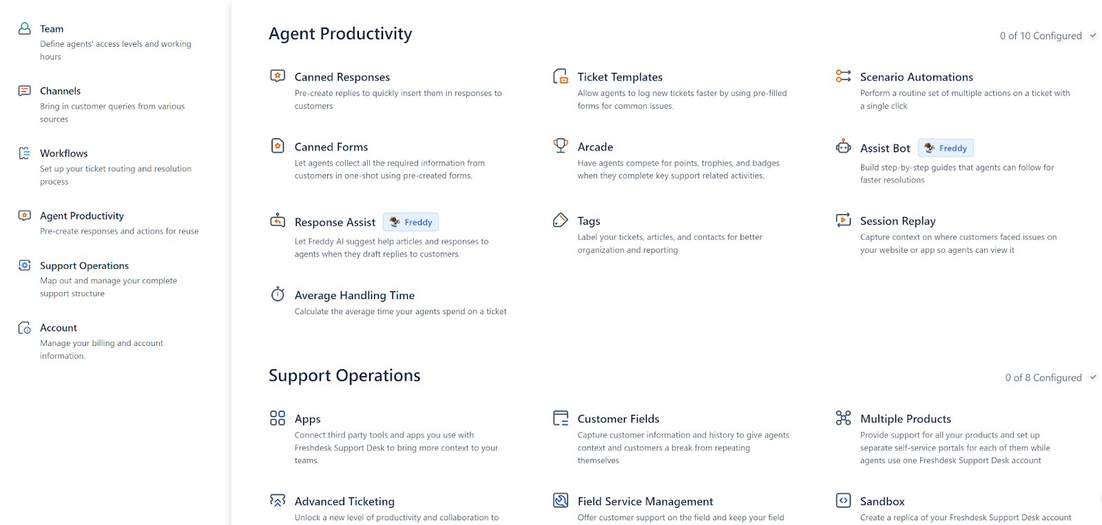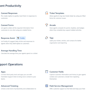 Имате на разположение някои функции за съвместна работа, управление на споразуменията за ниво на обслужване, управление на запитвания с помощта на ИИ, свързване на посещения на място със запитване, формуляри на база на контекста. Съществуват софтуери за управление на запитвания с повече функции, но всяка от функционалностите на Freshdesk има различни допълнителни функции, които гарантират отлична продуктивност и работен процес. Freshdesk може да ви помогне да обработвате имейли, обаждания, лайв чат, Twitter, Facebook, клиентски портал и електронни магазини.