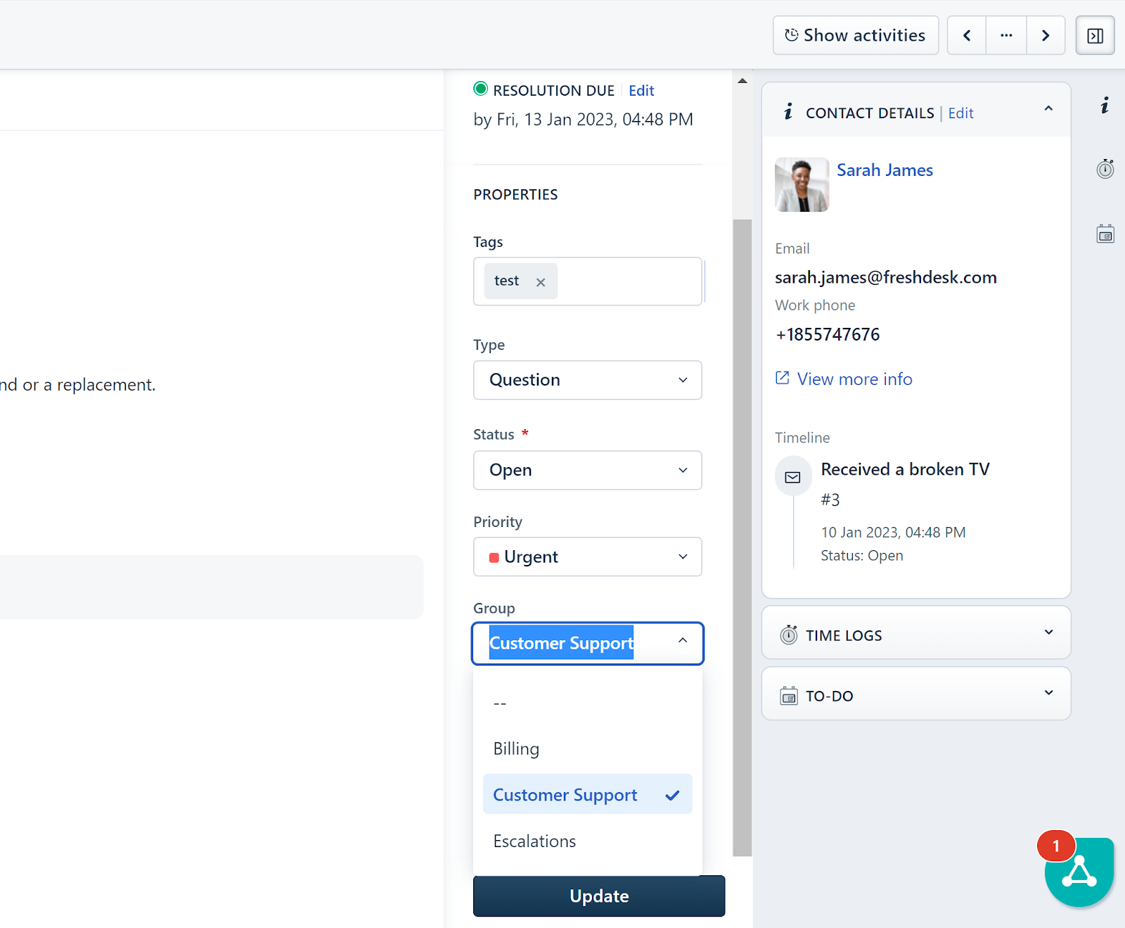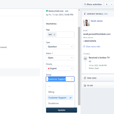 Freshdesk предлага пълния набор функции, които бихте очаквали от висок клас софтуер за управление на запитвания. Първата важна функционалност е Входящата кутия на екипа, в която се намират всички други функции и поддържа множество канали за комуникация – което значи, че можете да отговаряте в множество канали на едно място. Това е стандартна функционалност във всички софтуери за управление на запитвания. Налични са също известия за едновременна работа по запитване, шаблони за отговори, смарт известия, персонализиран изглед на запитванията, сливане на запитвания и дневник на дейността.