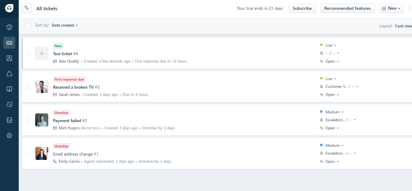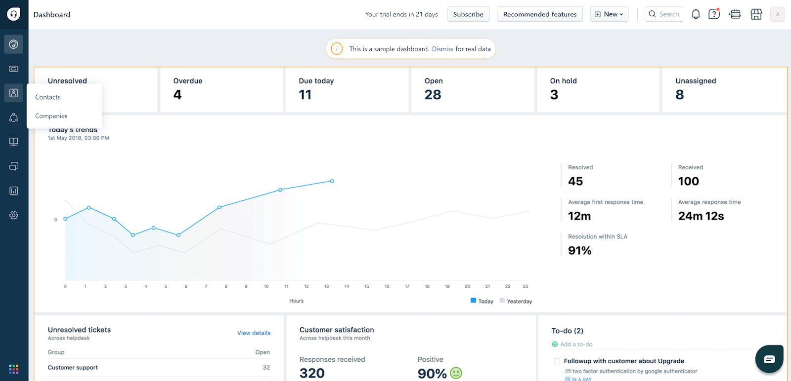 В левия панел се намира главното меню, където имате достъп до най-важните инструменти във Freshdesk. Други опции можете да откриете на други места в интерфейса, обикновено лесни за намиране бладорарение видимите бутони с описания. Преди да започнем с тестването, нека да погледнем списъка с функции, които Freshdesk предлага в системата си за управление на запитвания.